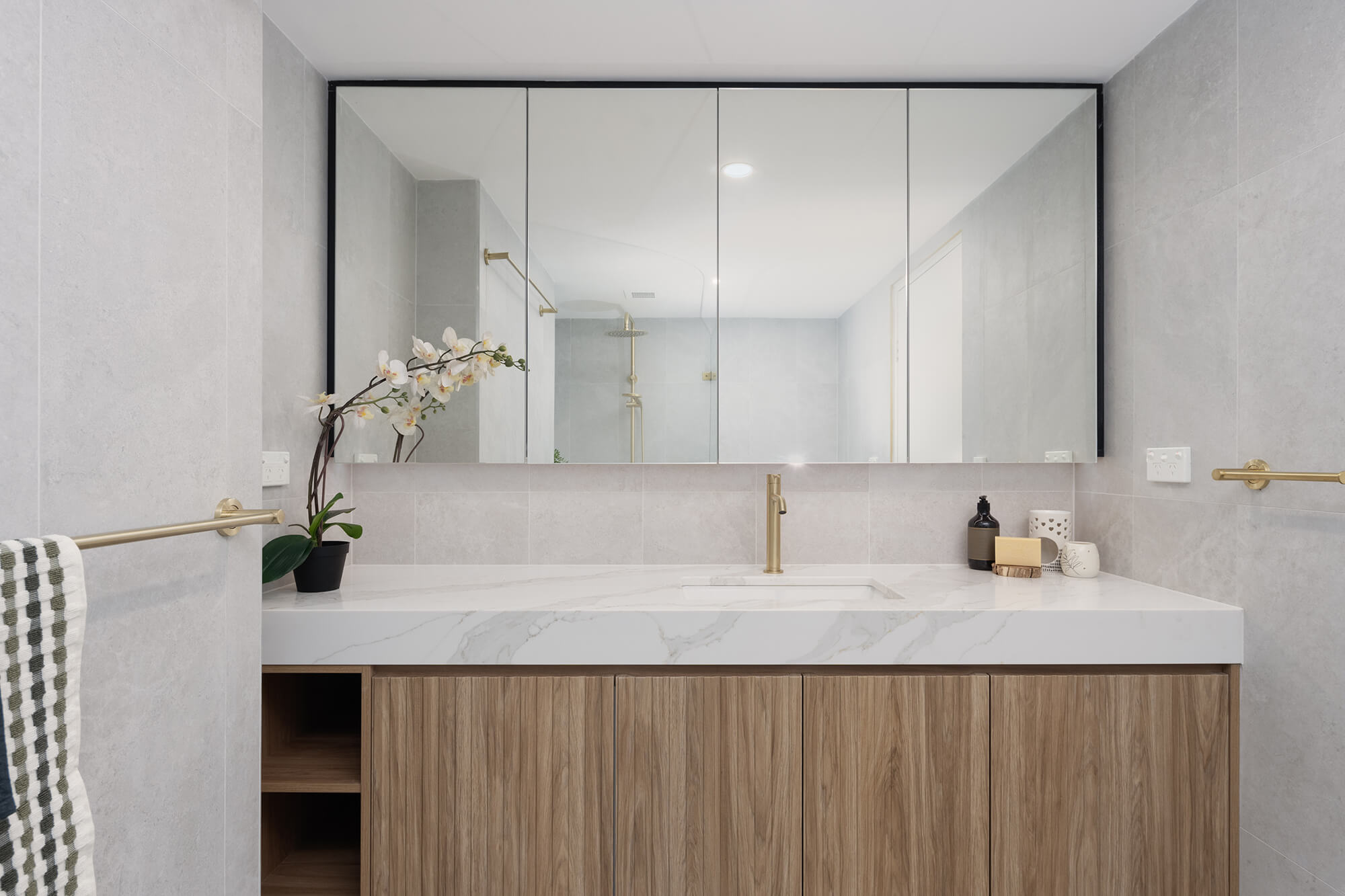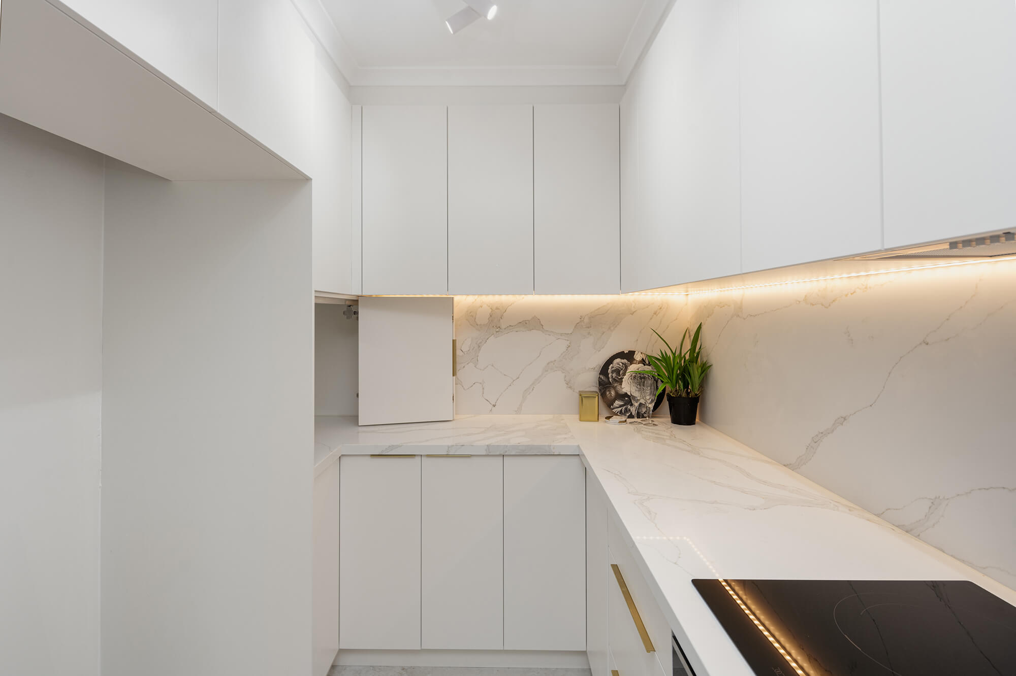 This project transformed a dated three-bedroom apartment into a sleek, modern living space. The focus was on achieving the aesthetic the clients were looking for and improving functionality with custom storage solutions.